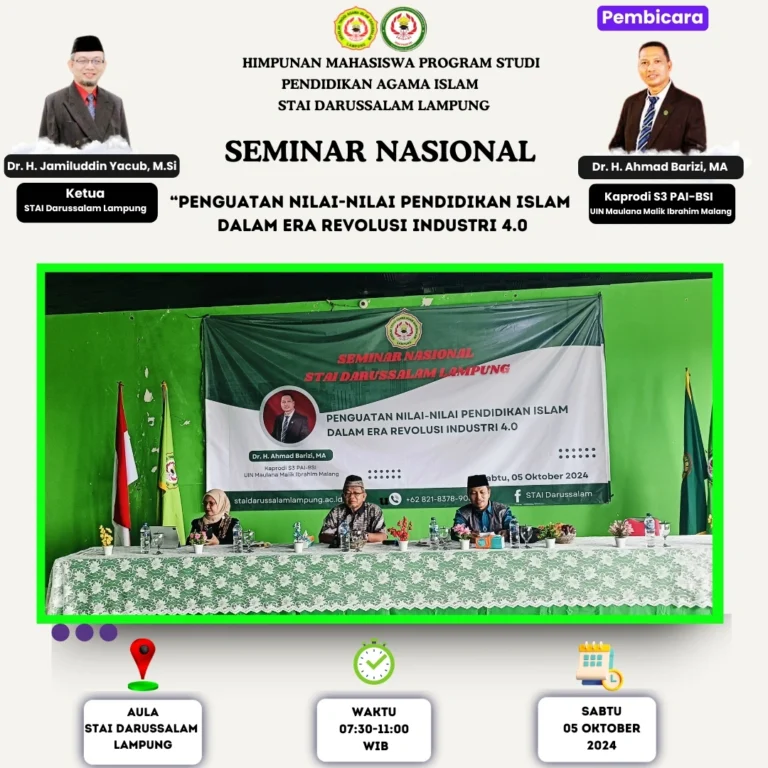 Pada Sabtu, 5 Oktober 2024, STAI Darussalam Lampung sukses menggelar Seminar Nasional dengan tema “Penguatan Nilai-Nilai Pendidikan Islam dalam Era Revolusi Industri 4.0”. Seminar ini sangat istimewa karena menghadirkan pemateri dari Universitas Islam Negeri (UIN) Maulana Malik Ibrahim Malang, yang…