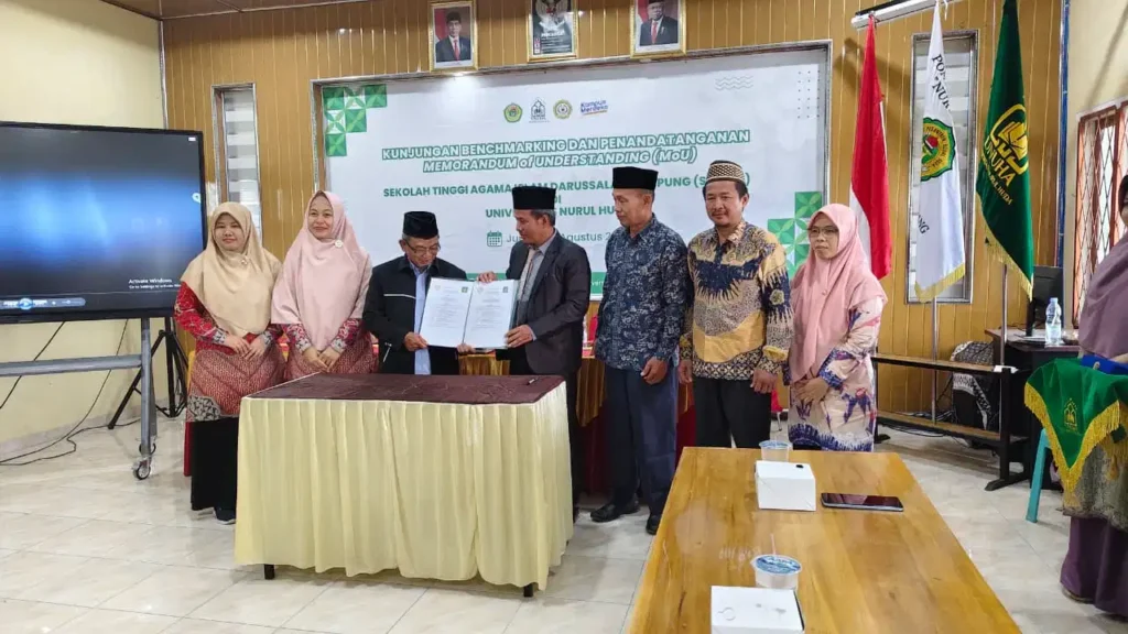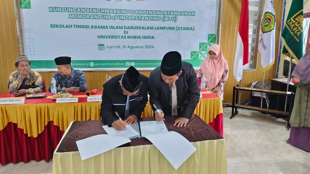 Setelah sambutan, acara dilanjutkan dengan penandatanganan Memorandum of Understanding (MoU) antara STAI Darussalam Lampung dan Universitas Nurul Huda. MoU ini bertujuan untuk memperkuat kerja sama dalam berbagai bidang pendidikan, penelitian, dan pengabdian masyarakat.